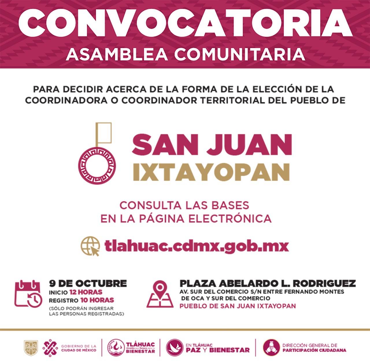 A través de redes sociales, autoridades de la alcaldía Tláhuac lanzaron la convocatoria para decidir la forma de la elección de la coordinadora o coordinador territorial del pueblo de San Juan Ixtayopan.