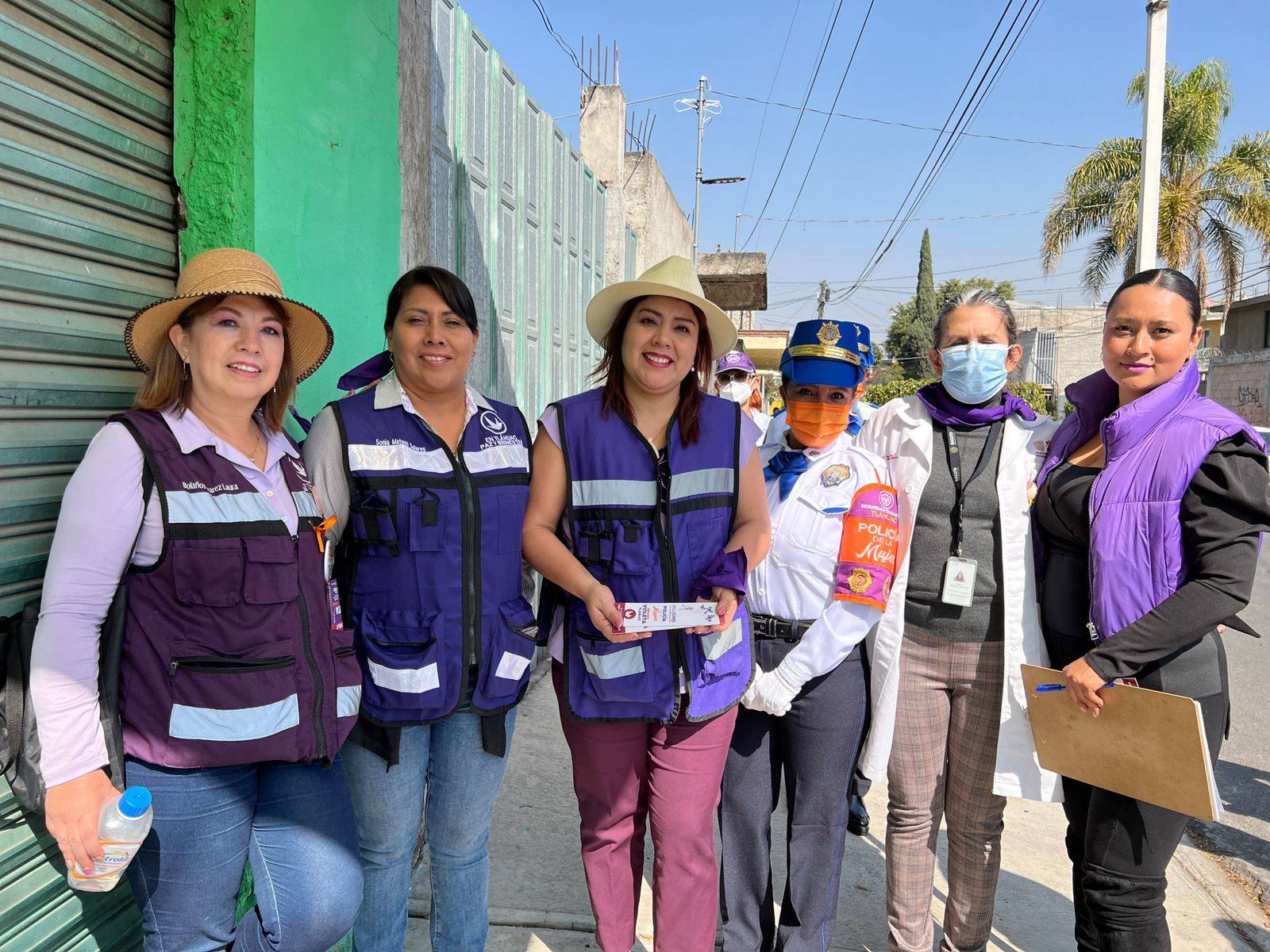 Tras el banderazo de salida, Berenice Hernández realizó un recorrido por las viviendas de la colonia para entregar trípticos y volantes con información sobre los programas en apoyo de las mujeres de Tláhuac: la Brigada Violeta y el Código Naranja.