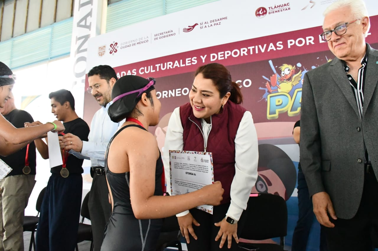 El secretario de gobernación, Martí Batres, la alcaldesa Berenice Hernández Calderón, el director de Centros del Deporte Escolar y Municipal, Arturo Contreras Bonilla, y el presidente de la Asociación de Usos y Costumbres de los Pueblos, Javier Rodea Pérez, encabezaron la realización del Torneo Acuático Al agua patos en la Alberca Olímpica Bicentenario de la Independencia en Tláhuac. El evento formó parte de las Jornadas Culturales y Deportivas por la Paz.